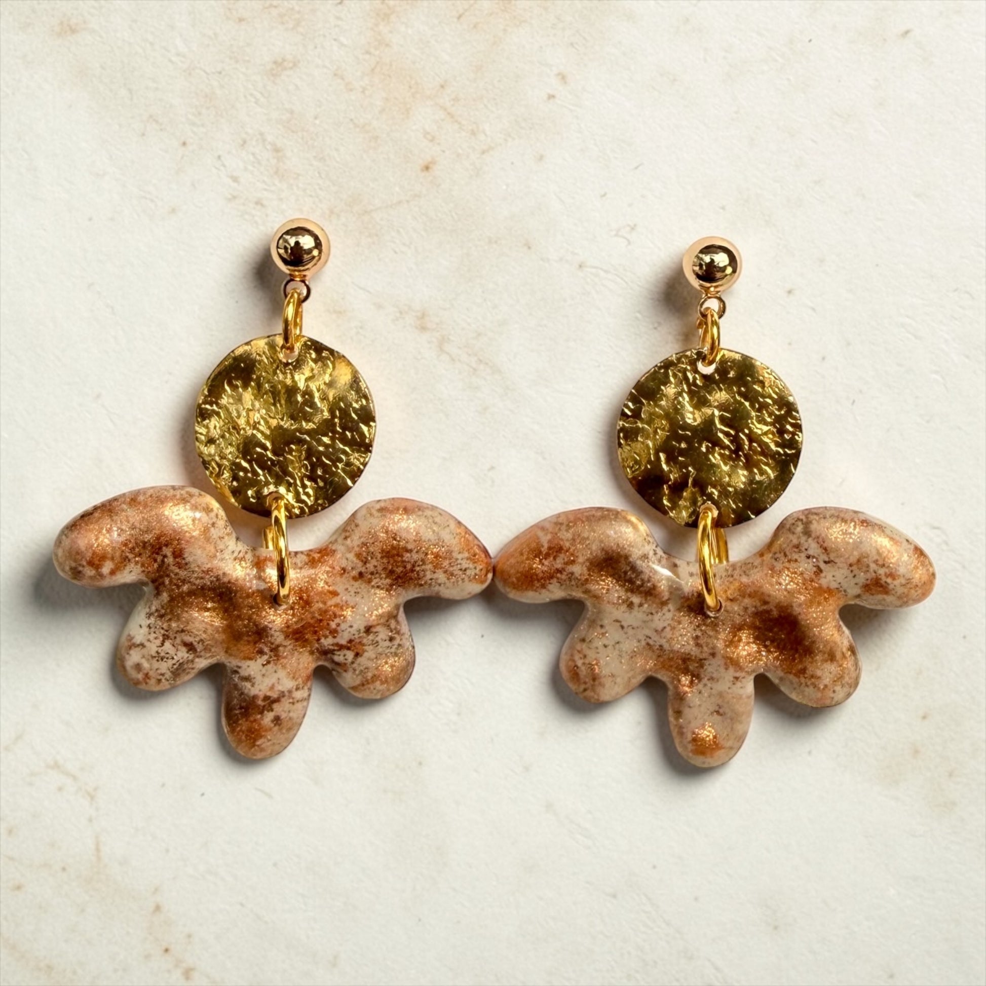 Pair with a flowy midi dress or elevate a white tee with these small handmade textured drop earrings featuring 14K gold‑filled ball posts, a hammered brass disc, and a sculpted polymer clay pendant sealed in clear resin for added shine and durability.